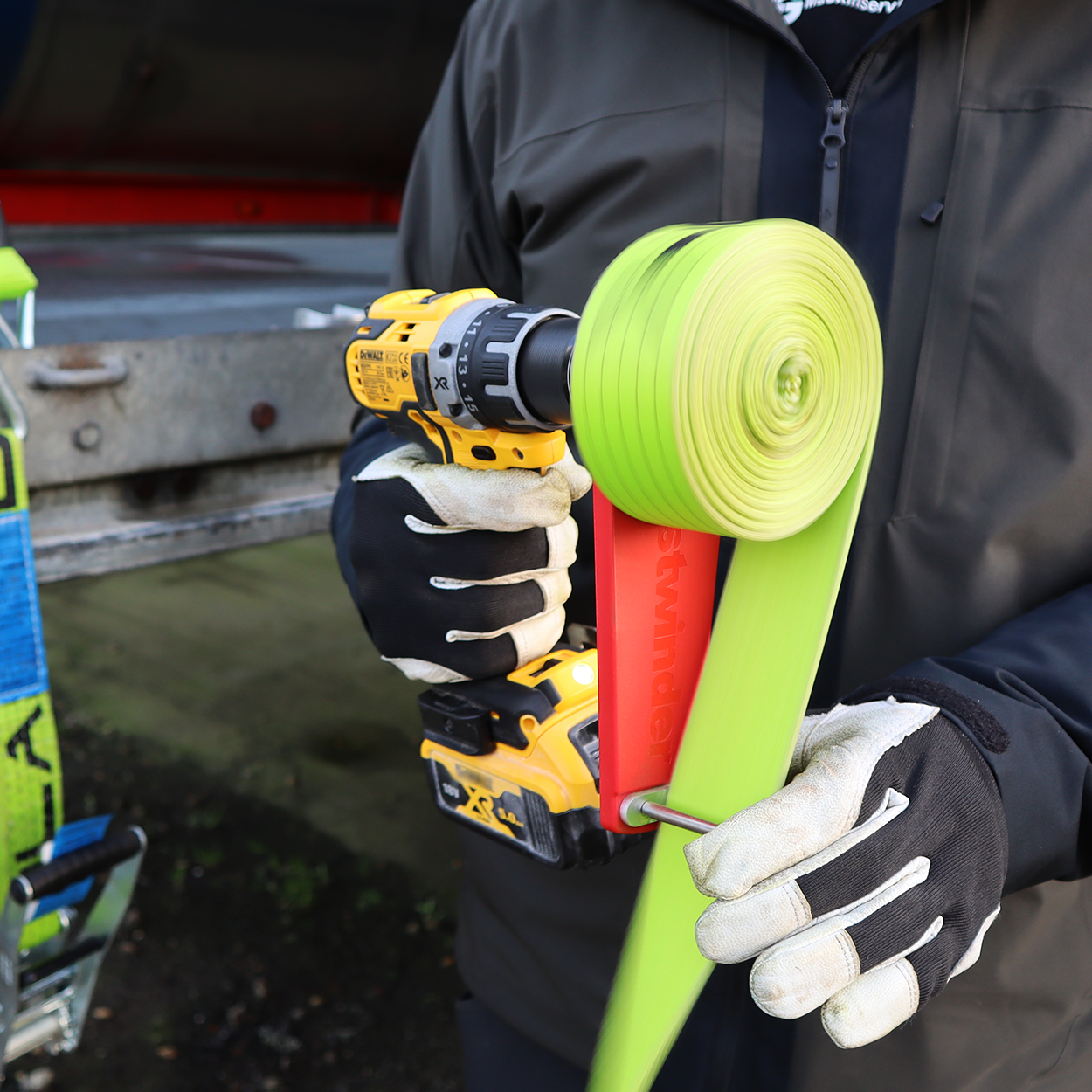 Lightweight all-round strap winder for a cordless drill. Made in the original and protected DYNELLO® design including the innovative strap-steer for excellent control of the lashing strap during winding. Use the strap winder with a cordless drill (Ø10 mm shaft). Recommended drill maximum winding speed 400 RPM (!)